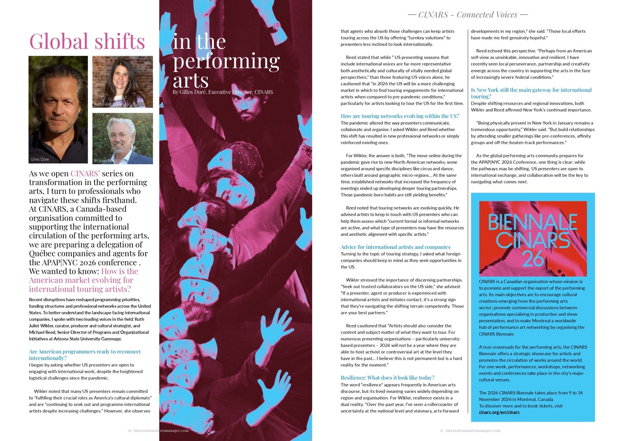 Véritable carrefour du spectacle vivant, la Biennale CINARS offre une vitrine stratégique pour les artistes et favorise la circulation des œuvres à travers le monde. Depuis 1984, CINARS rassemble tous les deux ans à Montréal les professionnel.le.s des arts de la scène issu.e.s du monde entier. Pendant une semaine, spectacles, ateliers, réseautage et conférences s’enchaînent dans les grands lieux culturels de la ville.